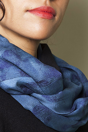 Disponible en tour de cou 2 tissus : soie imprimée feuilles bleues sur fond bleu doublée dans un tissu chaîne trame cachemire noir